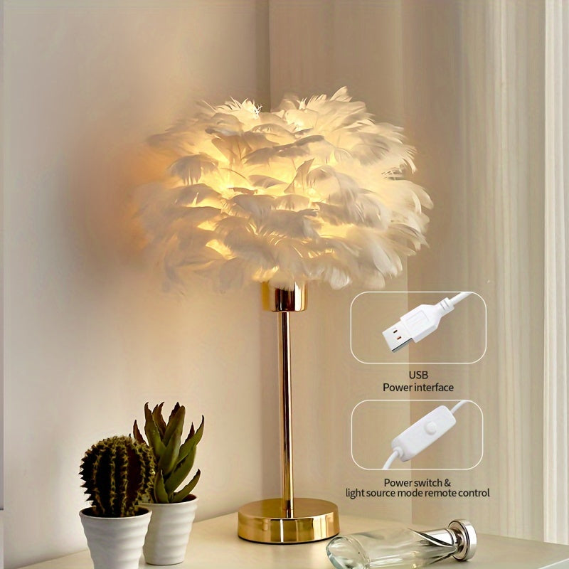 בסיס מתכת בציפוי זהב, אהיל בד ארוג, ונוצות לבנות שמפזרות אור רך וחלומי. חיבור USB נמוך-מתח (5V) וכפתור הדלקה נוח. מושלם לאווירה זוגית, סלון, קפה ביתי או כמתנה שמרגישה “וואו”.