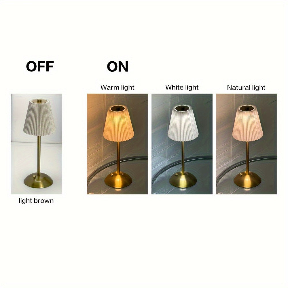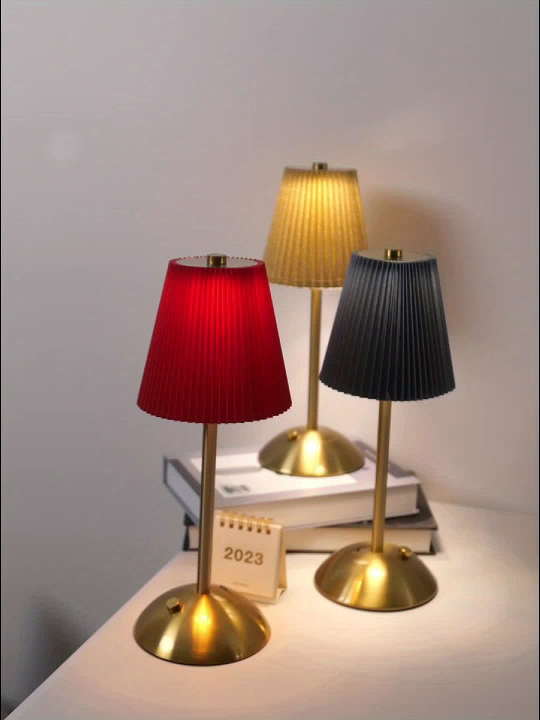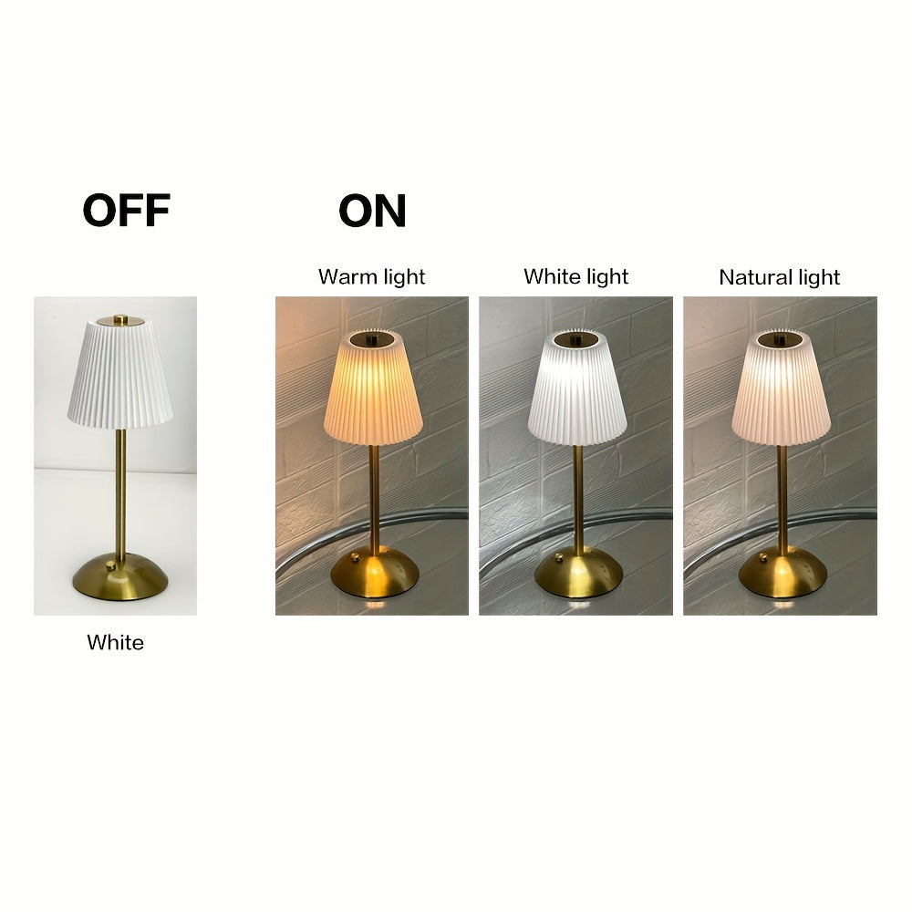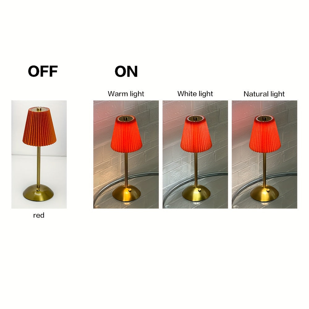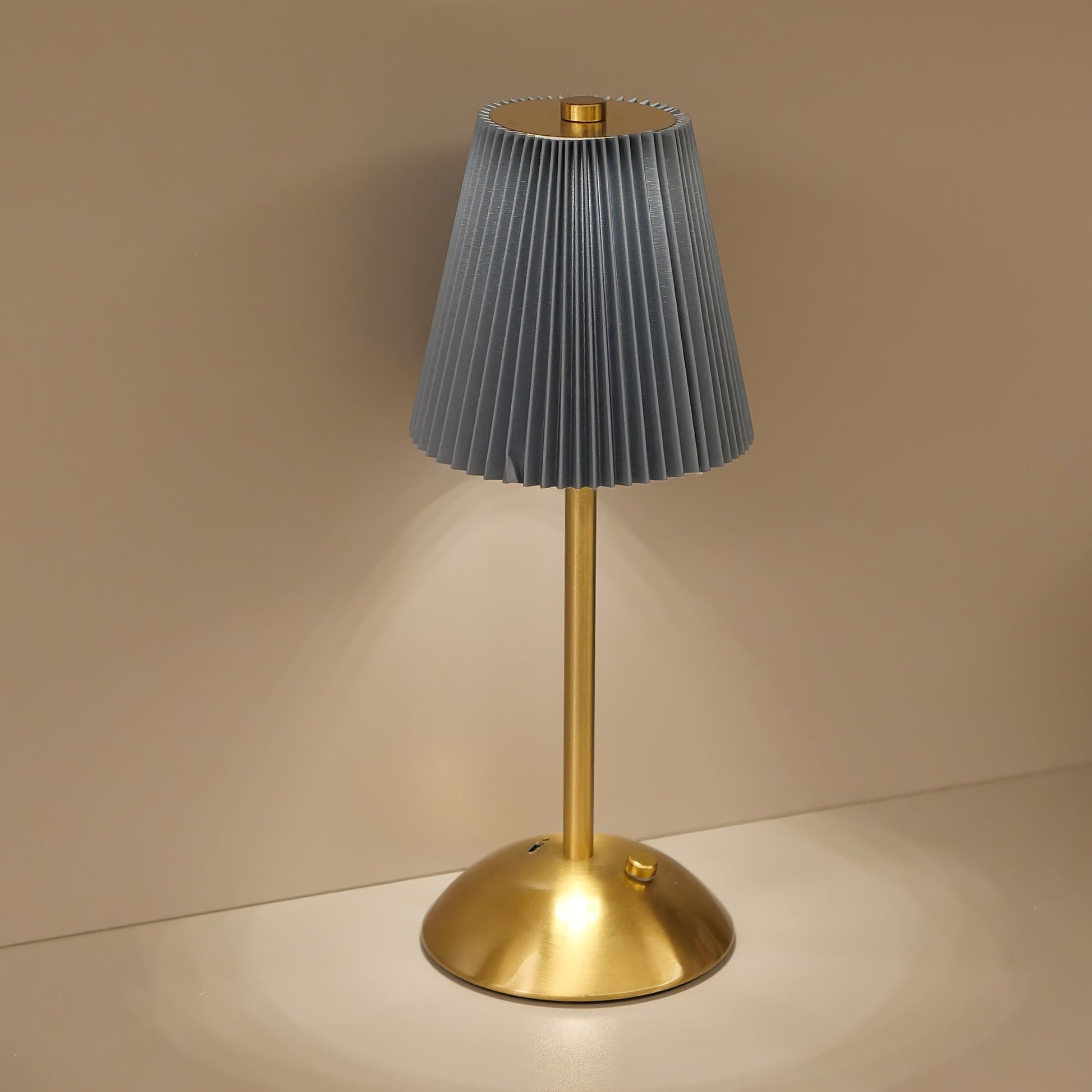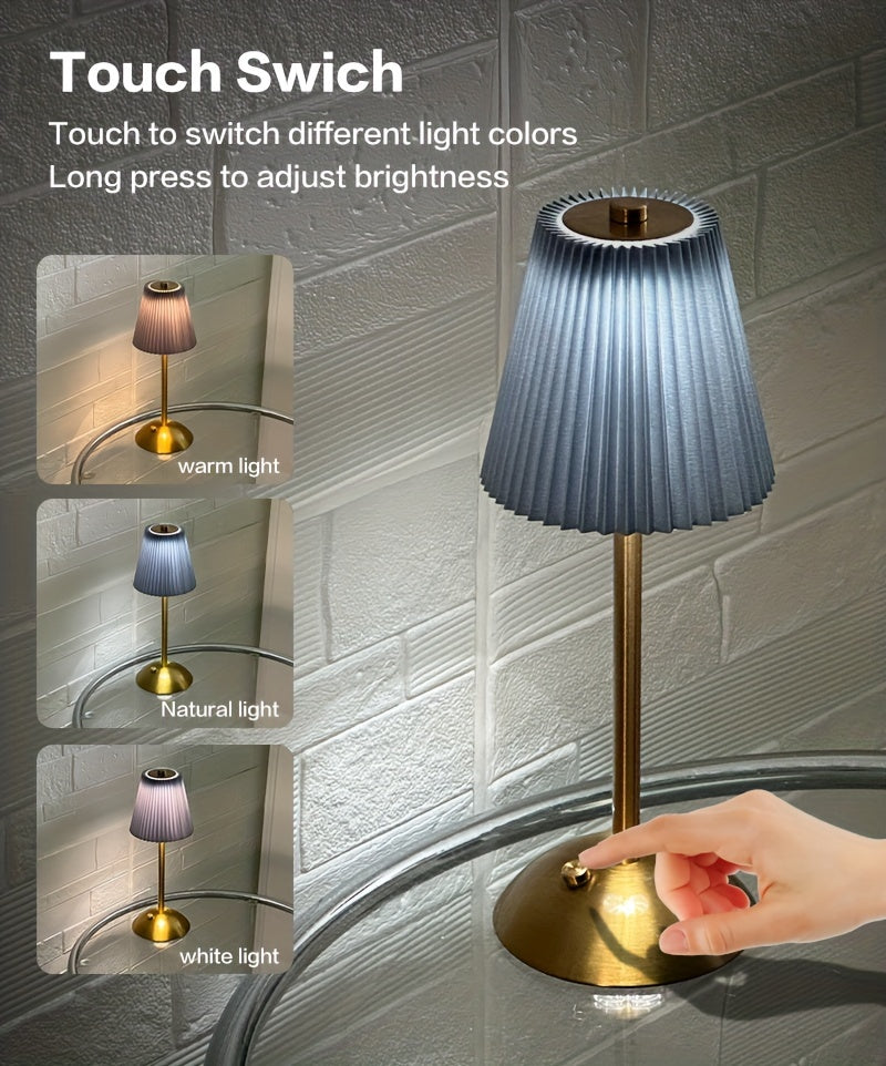 מנורה אלגנטית עם אהיל קפלים (פליסה) ורגל מתכת בגימור מוברש. שלוש טמפרטורות אור + עמעום רציף במגע, נטענת USB — בלי כבלים בזמן השימוש. זמינה בצבעי אהיל: לבן, אדום, אפור וזהוב.
