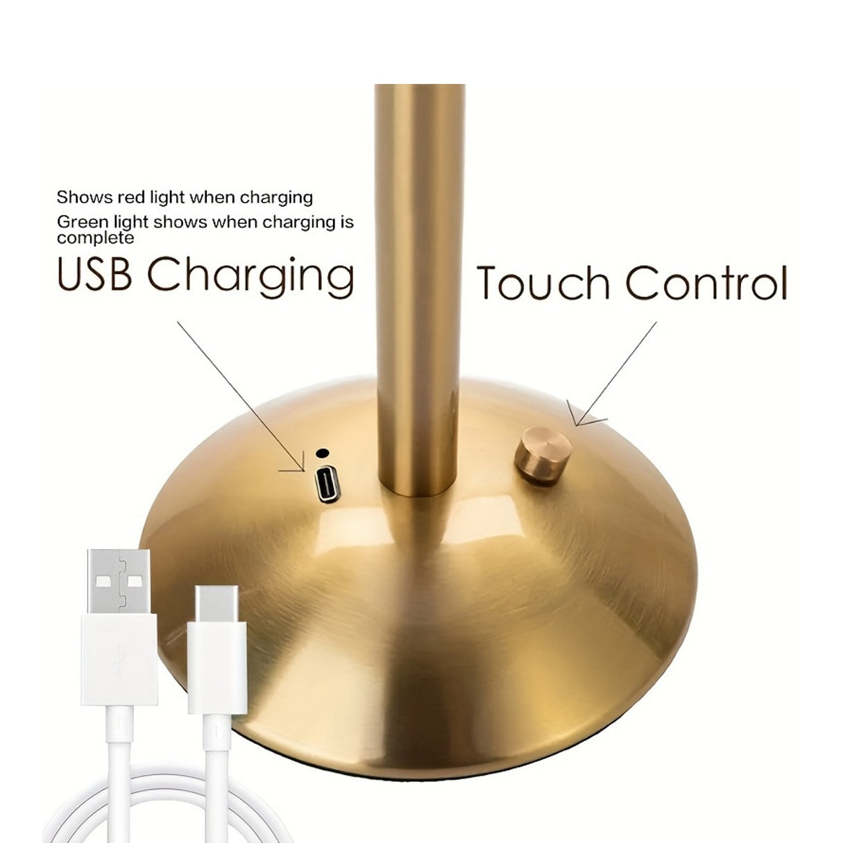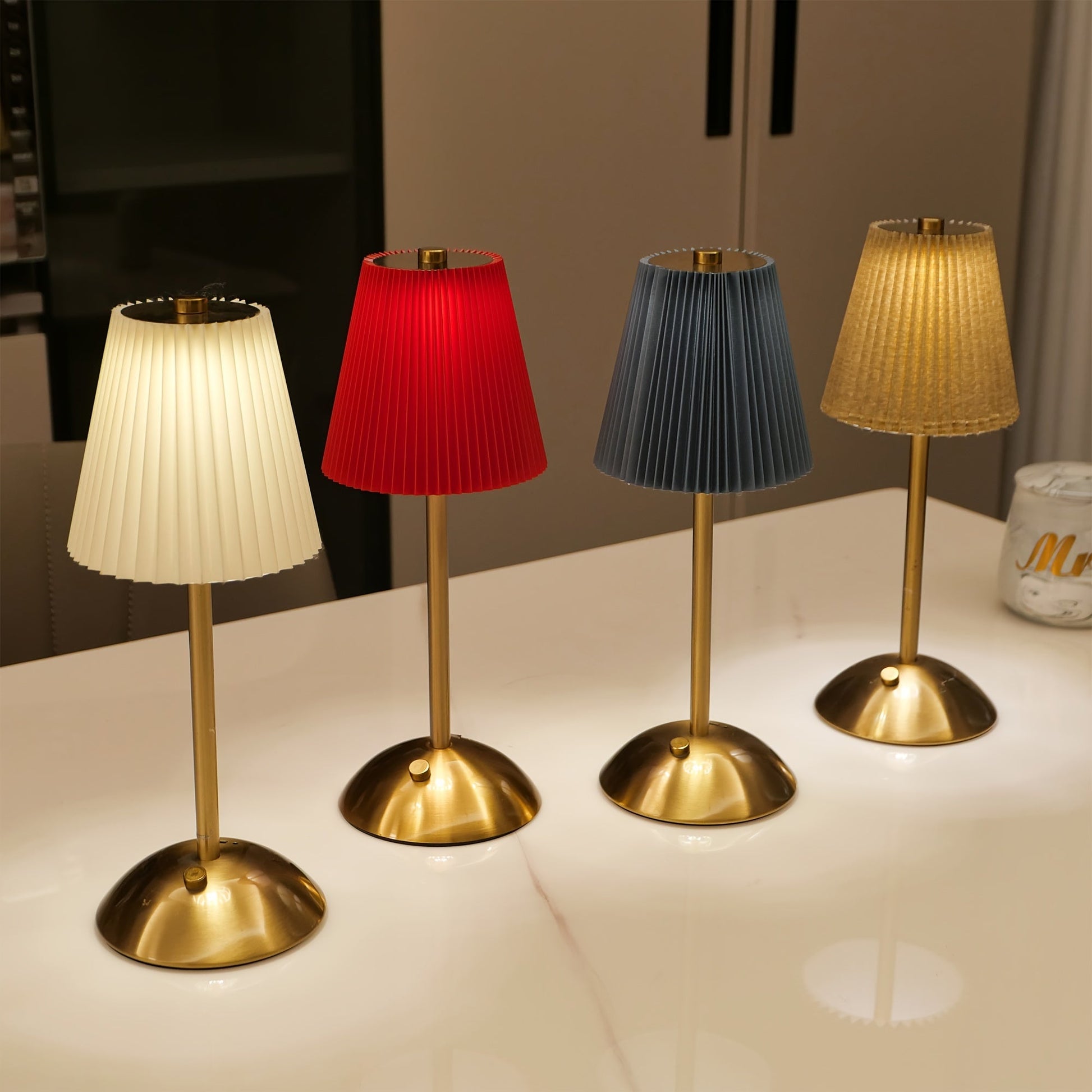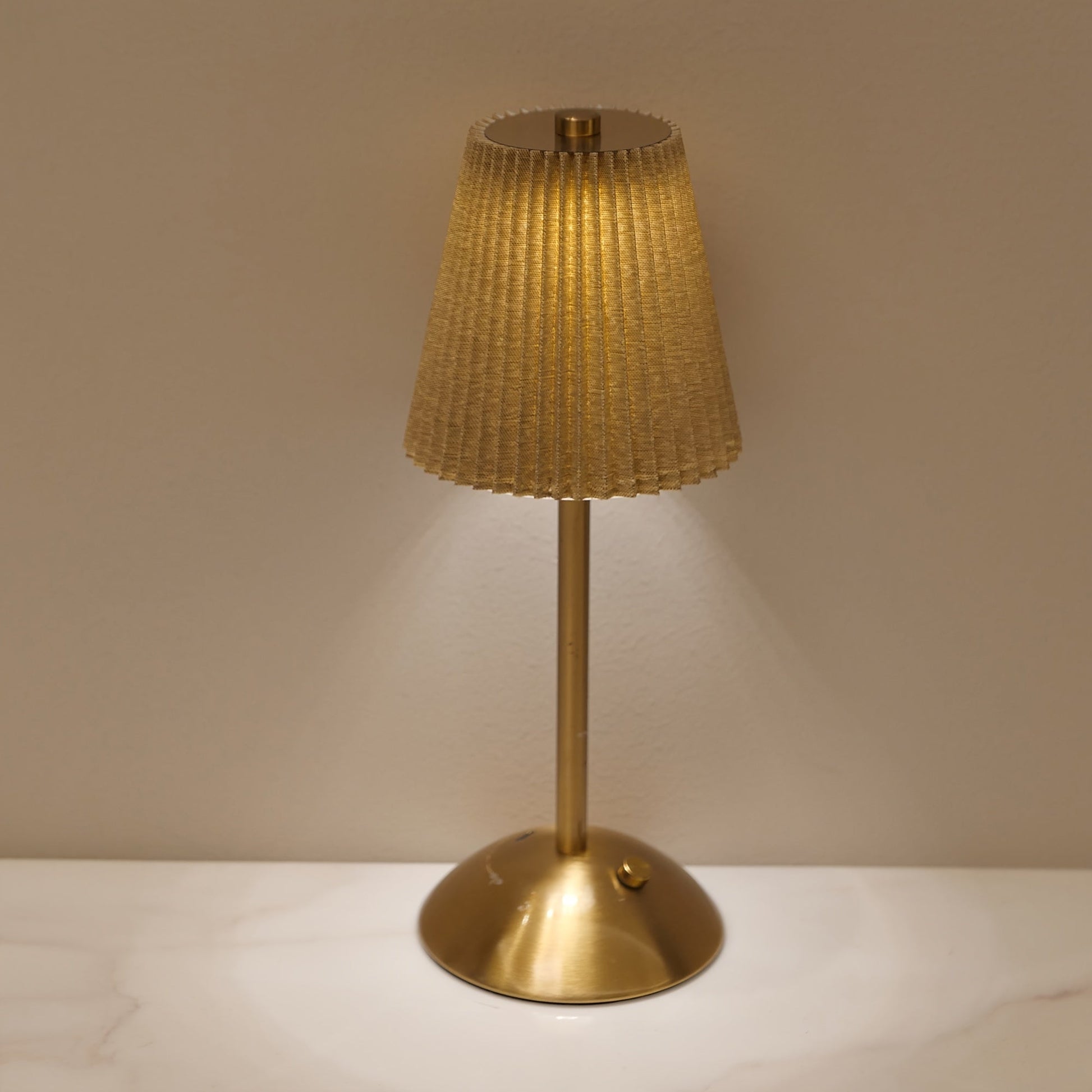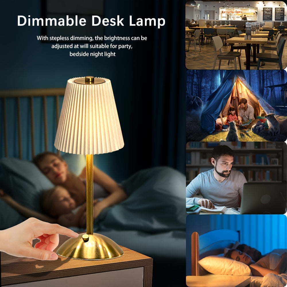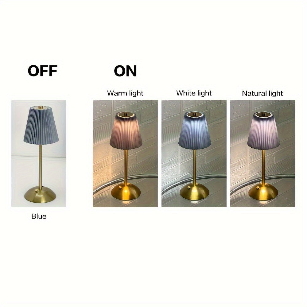 מנורה אלגנטית עם אהיל קפלים (פליסה) ורגל מתכת בגימור מוברש. שלוש טמפרטורות אור + עמעום רציף במגע, נטענת USB — בלי כבלים בזמן השימוש. זמינה בצבעי אהיל: לבן, אדום, אפור וזהוב.