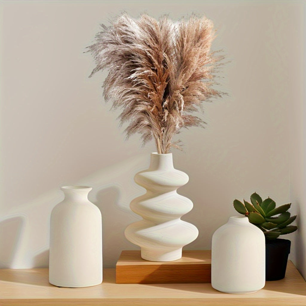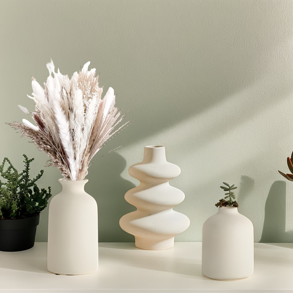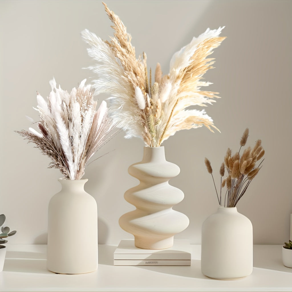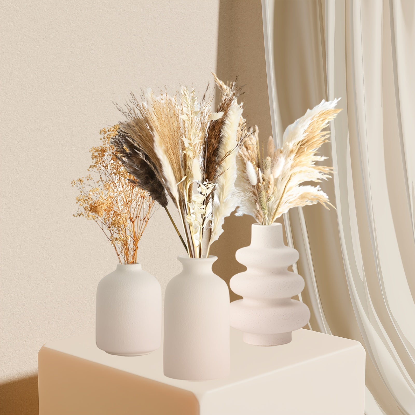 שלישיית אגרטלים ידניים במרקם מאט רך, צבע אוף-וויט חמים. מניחים ענף, פמפס או פרח יבש — והסלון מקבל שקט וניקיון עיצובי. מתאים למדף, קונסולה או מזנון. מותג NJCHARMS, חומר קרמיקה, סגנון Boho.