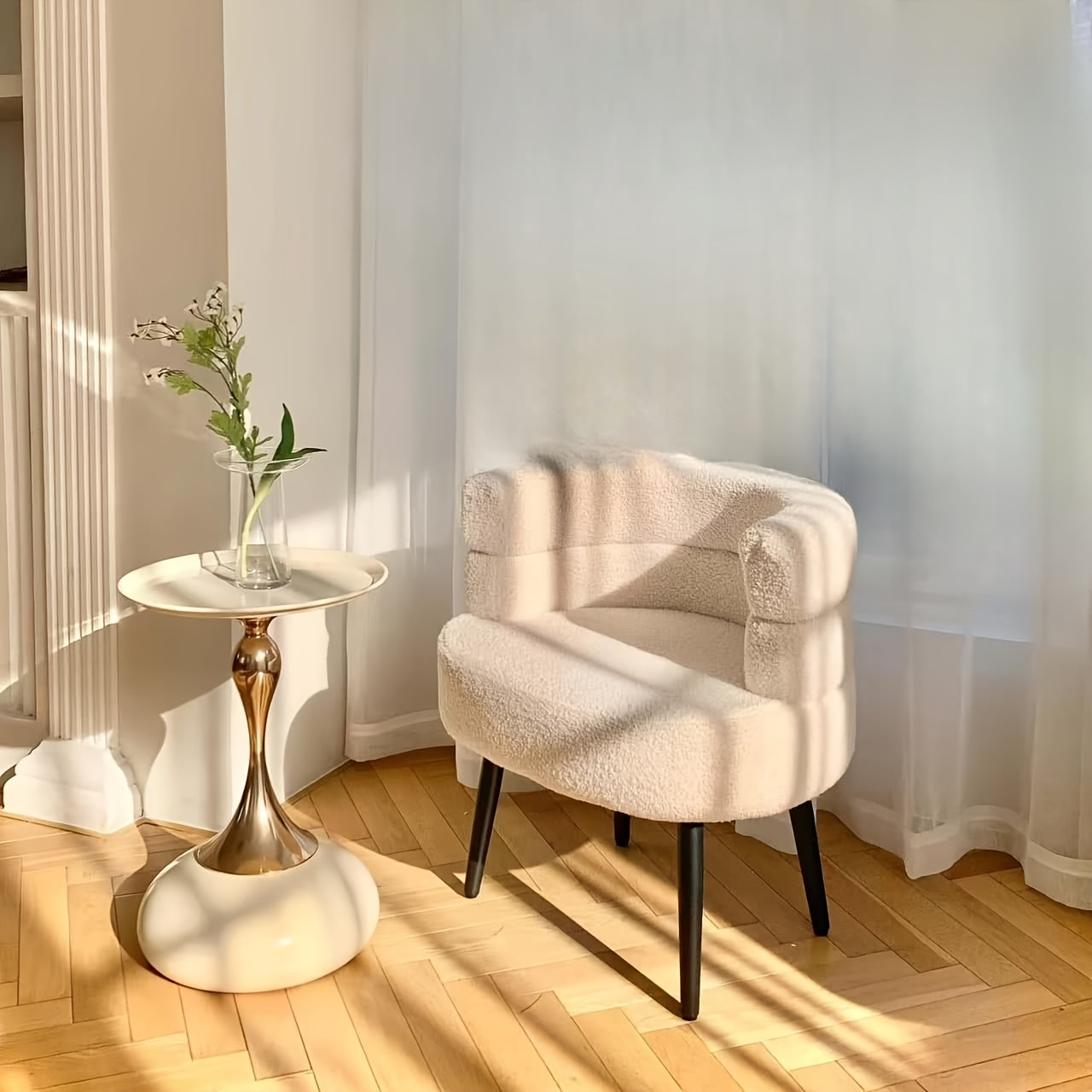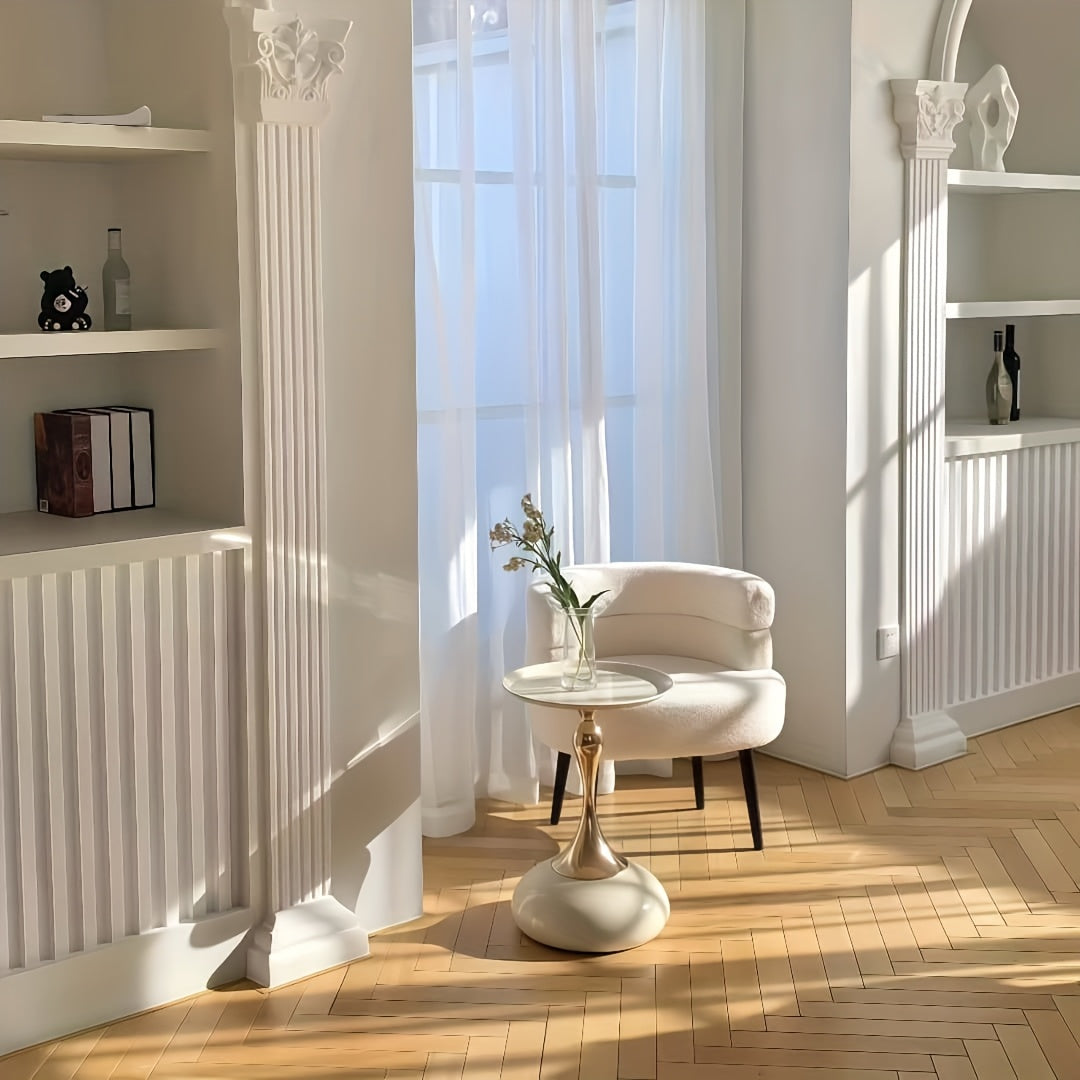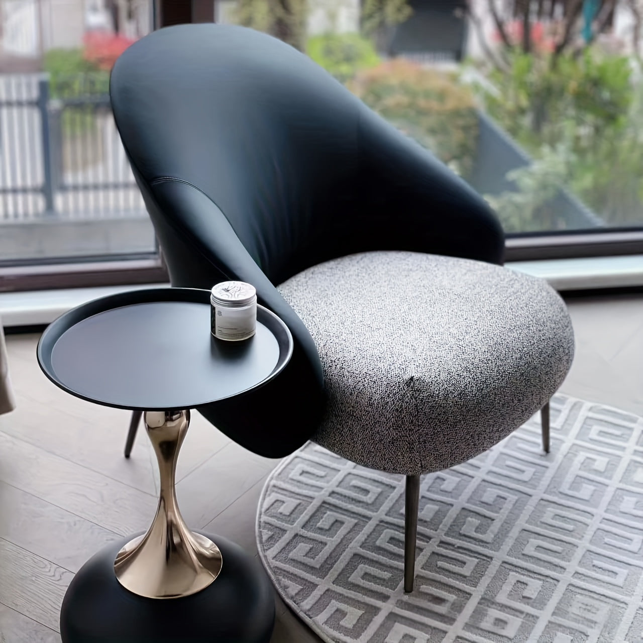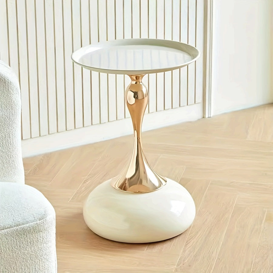 בסיס מעוגל יציב, רגל פסלית בציפוי זהב ופלטה עגולה עם שפה עדינה – בדיוק המקום לכוס קפה, ספר ושלט. עיצוב מודרני שמוסיף יוקרה גם בחלל קטן.